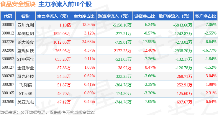 食物平安板块个股资金流向见下表:证券之星消